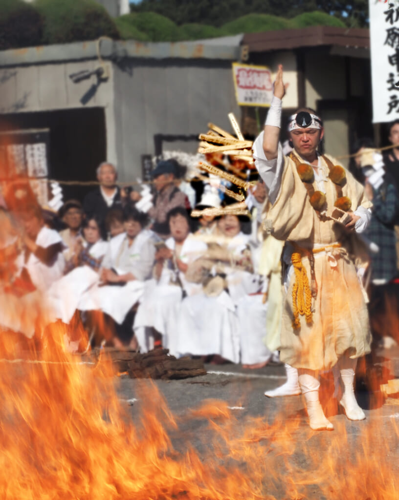 新座観音における柴灯大護摩「火渡り祭」は、およそ50年の歴史を誇り、当山先達山伏による修験道の修行であります。